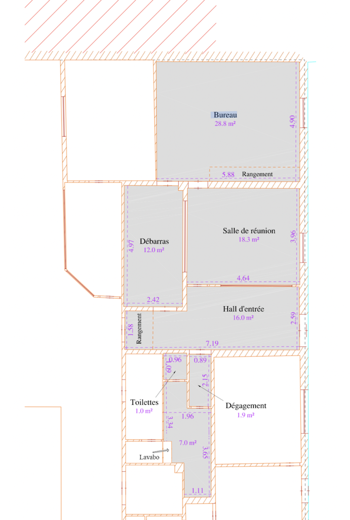Un ensemble de bureaux d’une surface d’environ 87.50 m2 comprenant : Un coin cuisine avec évier un WC, une pièce accueil et deux grands bureaux.